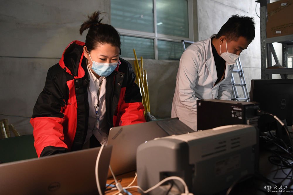 ↑佟锦媚(左)和同事在“猎鹰号”硬气膜实验室外的耗材区用电脑查看防疫物资领取情况(10月26日摄)。