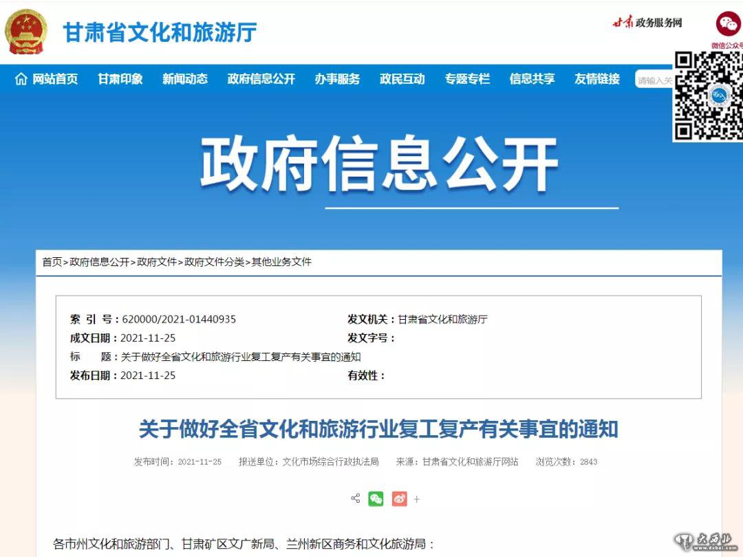 各市州文化和旅游部门、甘肃矿区文广新局、兰州新区商务和文化旅游局:根据省新冠肺炎疫情联防联控领导小组有关会议精神,为扎实做好文旅行业“六稳”工作,全面落实“六保”任务,推进全省文化和旅游行业复工复业,现就有关事项通知如下:即日起,恢复跨省团队旅游及“机票+酒店”业务;全省旅游景区、景点、文化娱乐场所、旅游演艺场所、影剧院、互联网上网服务场所、公共文化服务场所等有序恢复开放。发生过疫情的市州,文旅经营活动开展及场所开放,要征求当地疫情防控部门意见。各地文旅主管部门要发挥行业监管职能,督促指导公共文化服务单位、文化旅游企业严格落实各项疫情防控措施,常态化开展应急演练。公共文化服务单位、文旅经营企业要认真履行主体责任,严格执行文化和旅游部各场所疫情防控指南规定,全面落实“限量、预约、错峰”要求,做到常态防控、科学防控、精准防控。同时,要针对岁末年初安全生产工作特点,加强安全生产监管,确保全省文旅行业安全形势持续平稳有序。甘肃省文化和旅游厅2021年11月25日