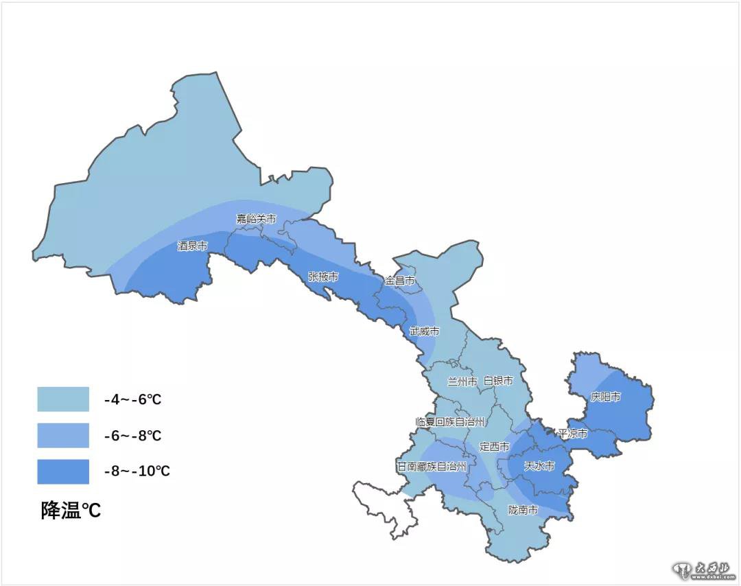 降温预报:27日夜间至29日,我省大部气温下降4~6℃,其中,天水、平凉、庆阳三市及定西市东部、陇南市北部部分地方及河西局部地方气温下降8~10℃(图1);河西最低气温将降至-15℃以下。