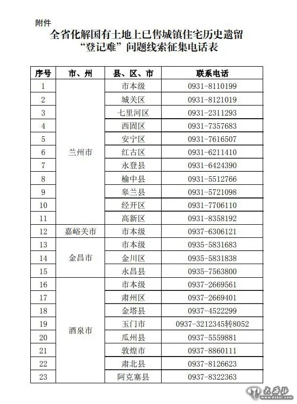 不动产登记涉及千家万户,事关广大人民群众切身利益。为践行以人民为中心的发展思想,在党史学习教育中深入开展“我为群众办实事”实践活动,积极化解国有土地上已售城镇住宅历史遗留“登记难”问题,保障群众合法权益,广泛接受社会监督,进一步加大政策宣传和问题摸排工作力度,现将各市州、兰州新区及各县(市、区)线索征集电话予以公布。