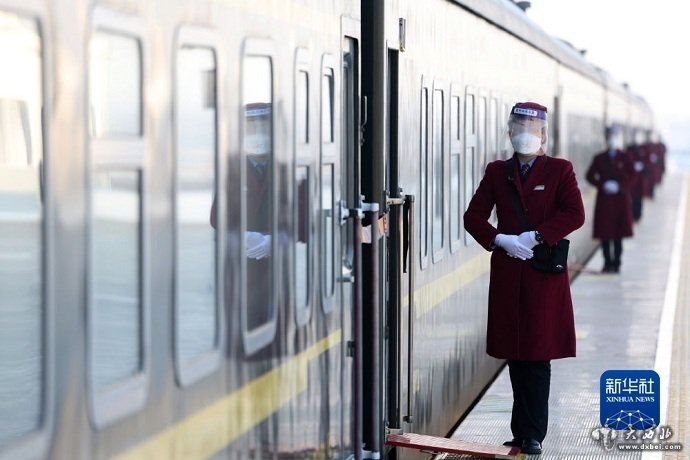 12月26日,酒额铁路酒泉至东风段首发列车的列车员在肃州车站站台准备迎接旅客。新华社记者陈斌摄
