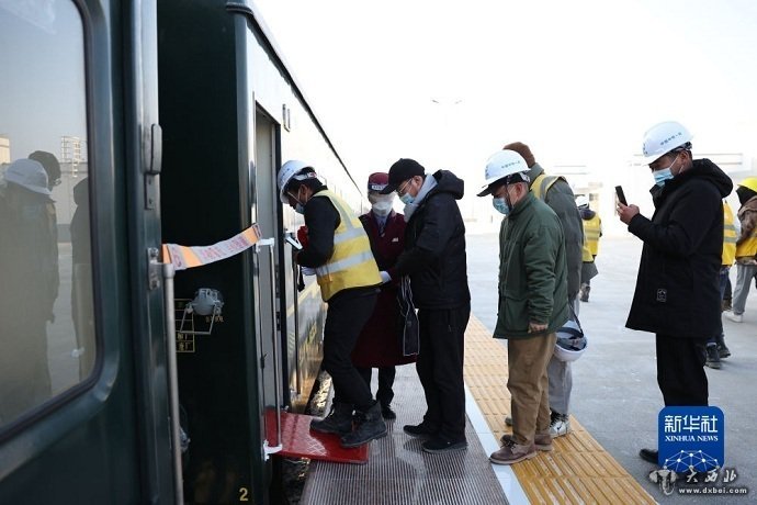 12月26日,铁路建设者从肃州车站登上酒额铁路酒泉至东风段首发列车。新华社记者陈斌摄