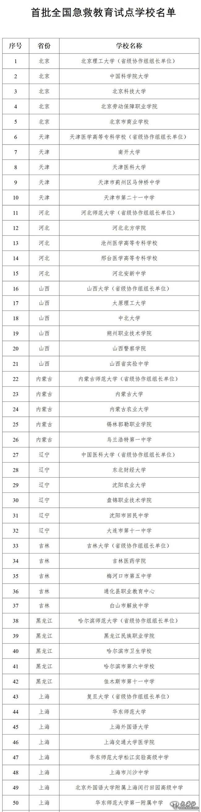 近日,教育部办公厅印发《关于做好首批全国学校急救教育试点建设和管理工作的通知》,公布首批201所全国急救教育试点学校名单和《首批全国学校急救教育试点工作实施方案》(以下简称《实施方案》)。甘肃中医药大学、甘肃资源环境职业技术大学、酒泉职业技术学院、兰州市第二中学、兰州市第三十三中学五所学校入选名单。