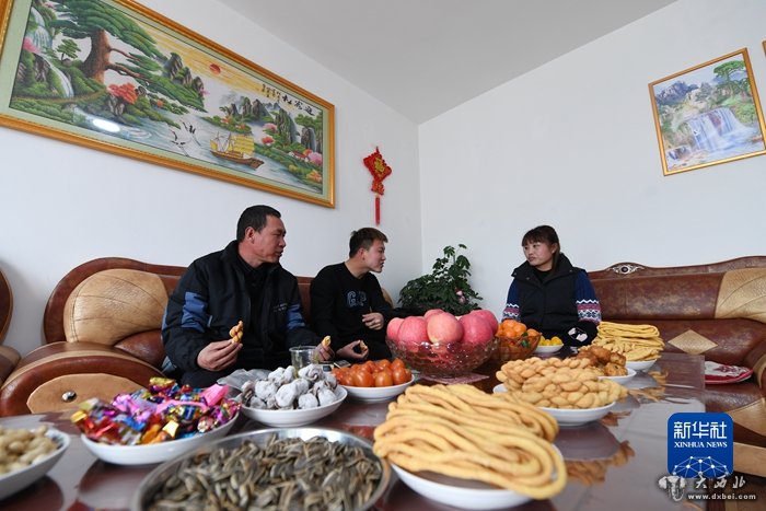 1月25日,在兰州新区舟曲避险搬迁安置点,刘长海(左)、宁兰玉(右)和孩子一起在家中吃饭。新华社记者范培珅摄