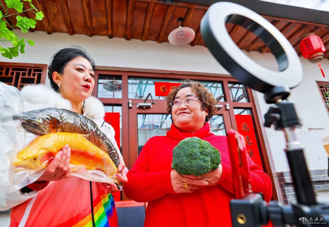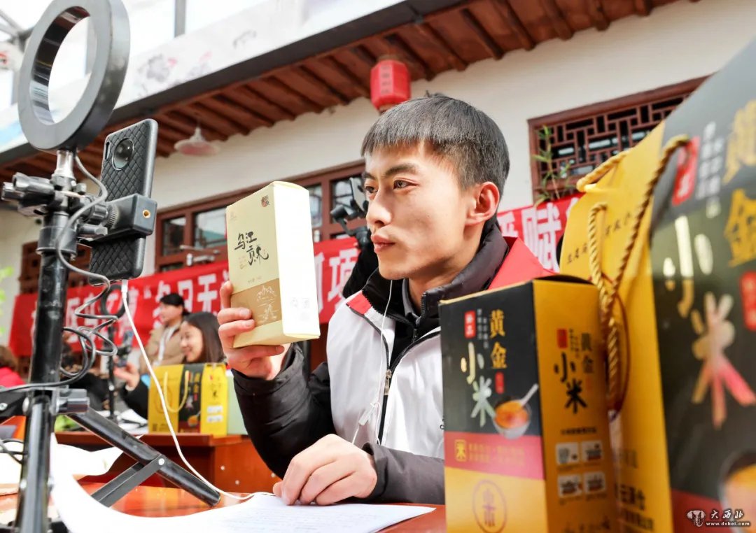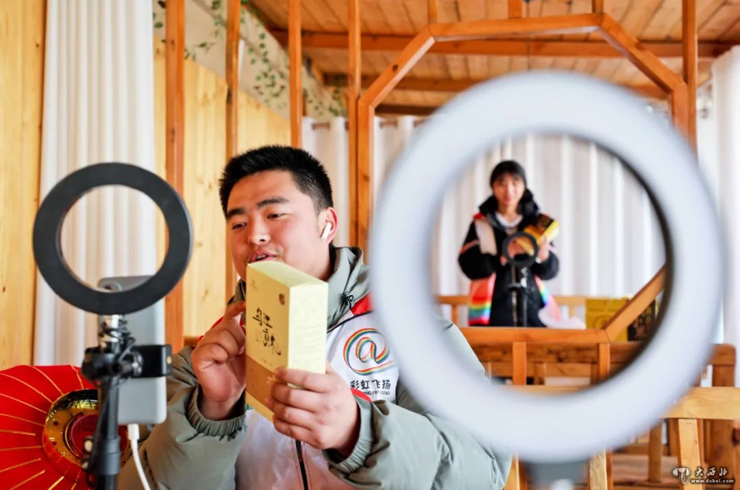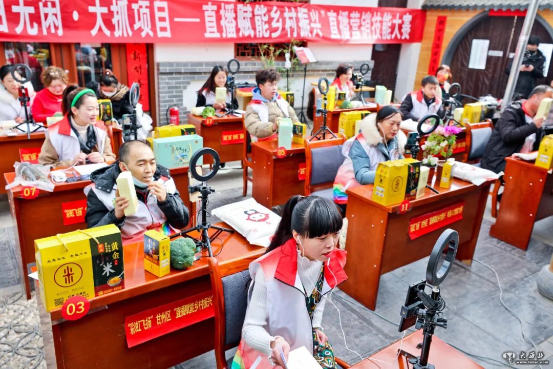 2月16日,甘州区乌江镇水云乡畔共享农庄彩虹飞扬青年电商大赛现场,青年电商主播们正在铆足劲为乌江镇的农产品“吆喝”。