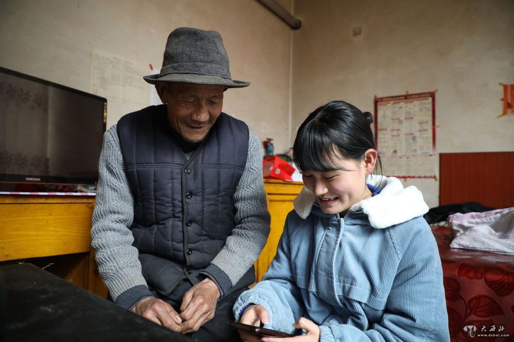2月17日,在甘肃省定西市临洮县洮阳镇河口村,符宁娜(右)和爷爷商量着在“三位一体”为民便民合作服务平台上预购农资。(新华社记者马希平摄)