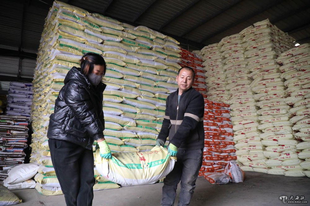 2月17日,在甘肃省定西市临洮县洮阳镇河口村,工人在临洮县惠民农资公司厂房内装运农资。(新华社记者马希平摄)