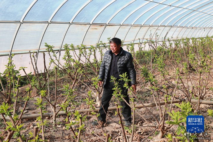 吕文战在温室中查看无花果树长势。(新华社记者杜哲宇摄)