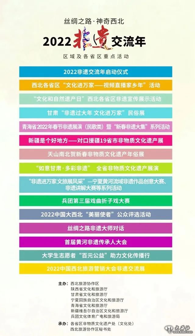 为了联合推广西北地区多彩的文化特色和丰富的旅游资源,向国内外讲好“丝绸之路·神奇西北”的文化和旅游故事,今年西北各省区和新疆生产建设兵团将联合举办2022“非遗交流年”主题活动,努力让社会认识西北地区源远流长、丰富多彩的非物质文化遗产,促进全区域非物质文化遗产交流、传承与活化。
