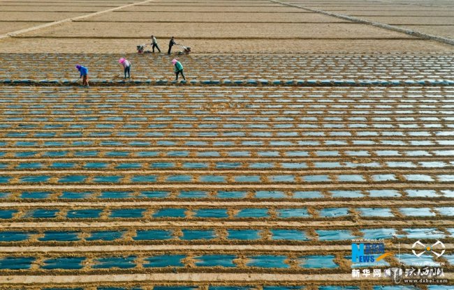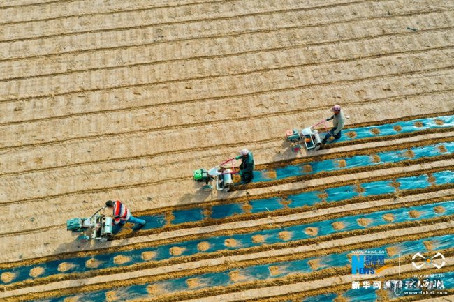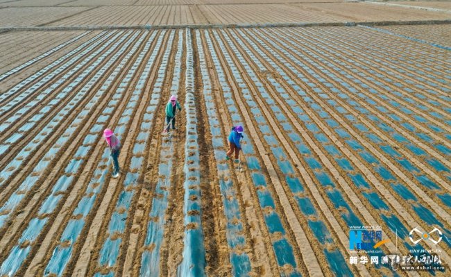 这是近日无人机拍摄的甘肃省张掖市临泽县平川镇一工程村制种玉米基地,农户们覆膜保墒的场景。新华网发 (王将 摄)