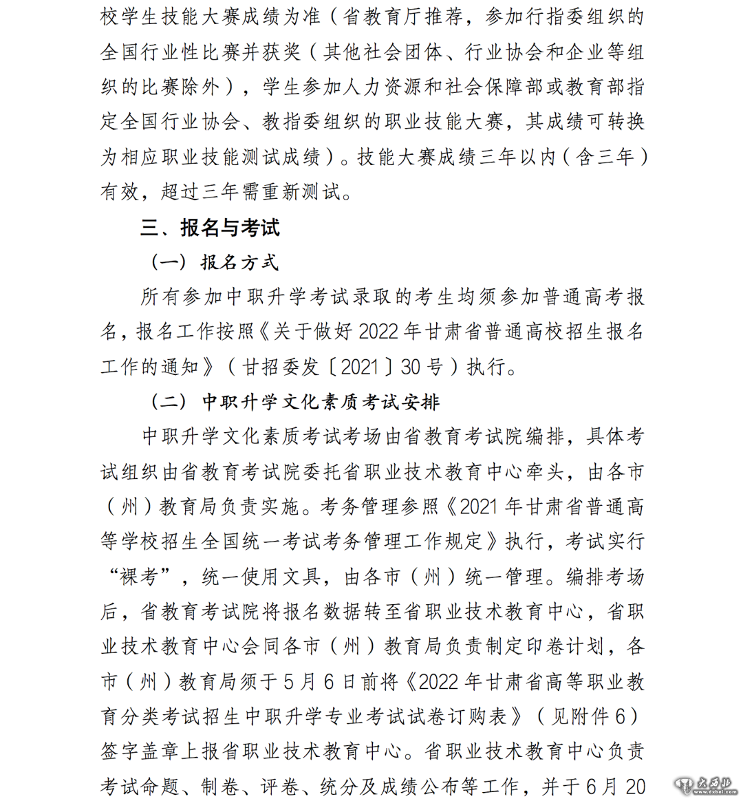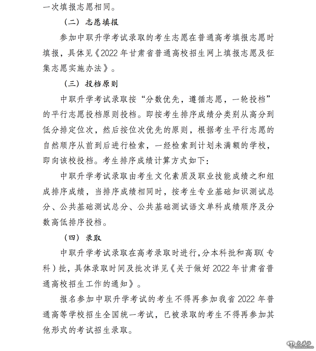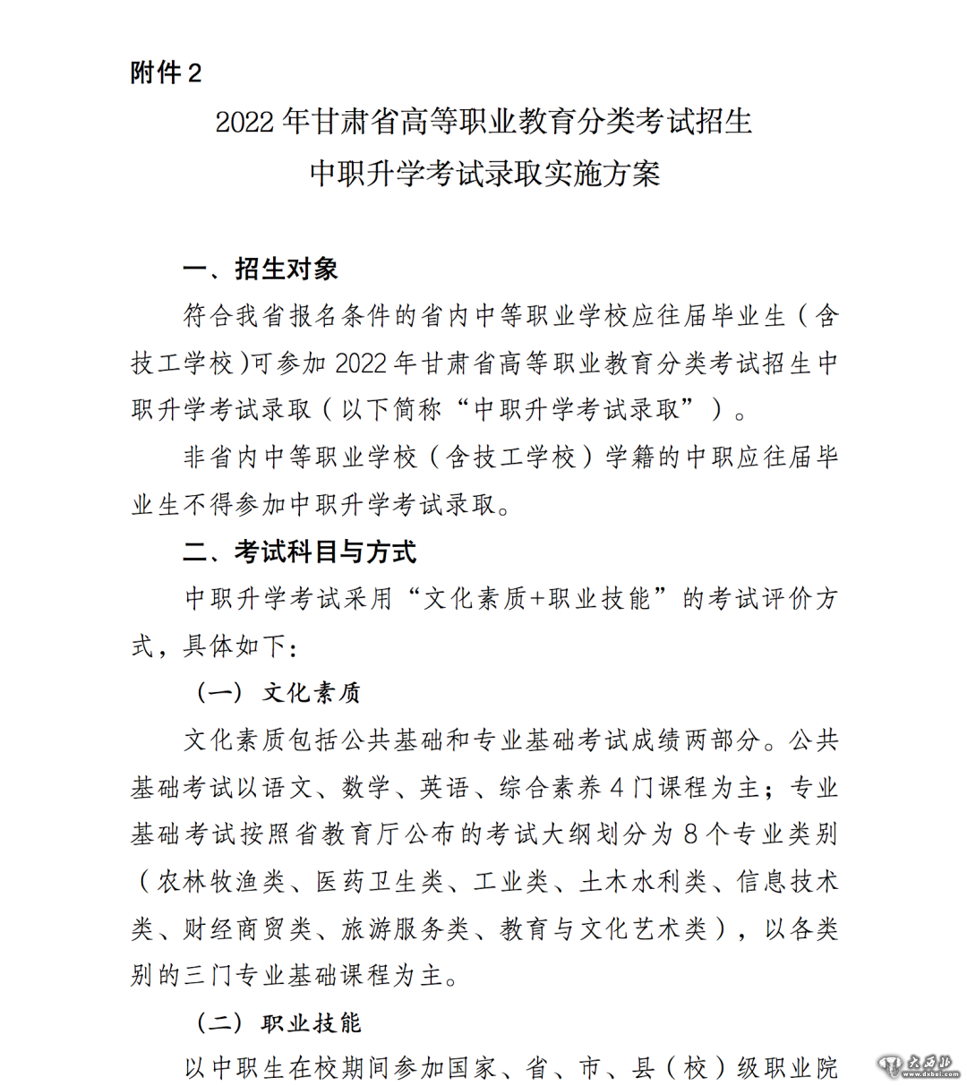 2.2022年甘肃省高等职业教育分类考试招生中职升学考试录取实施方案
