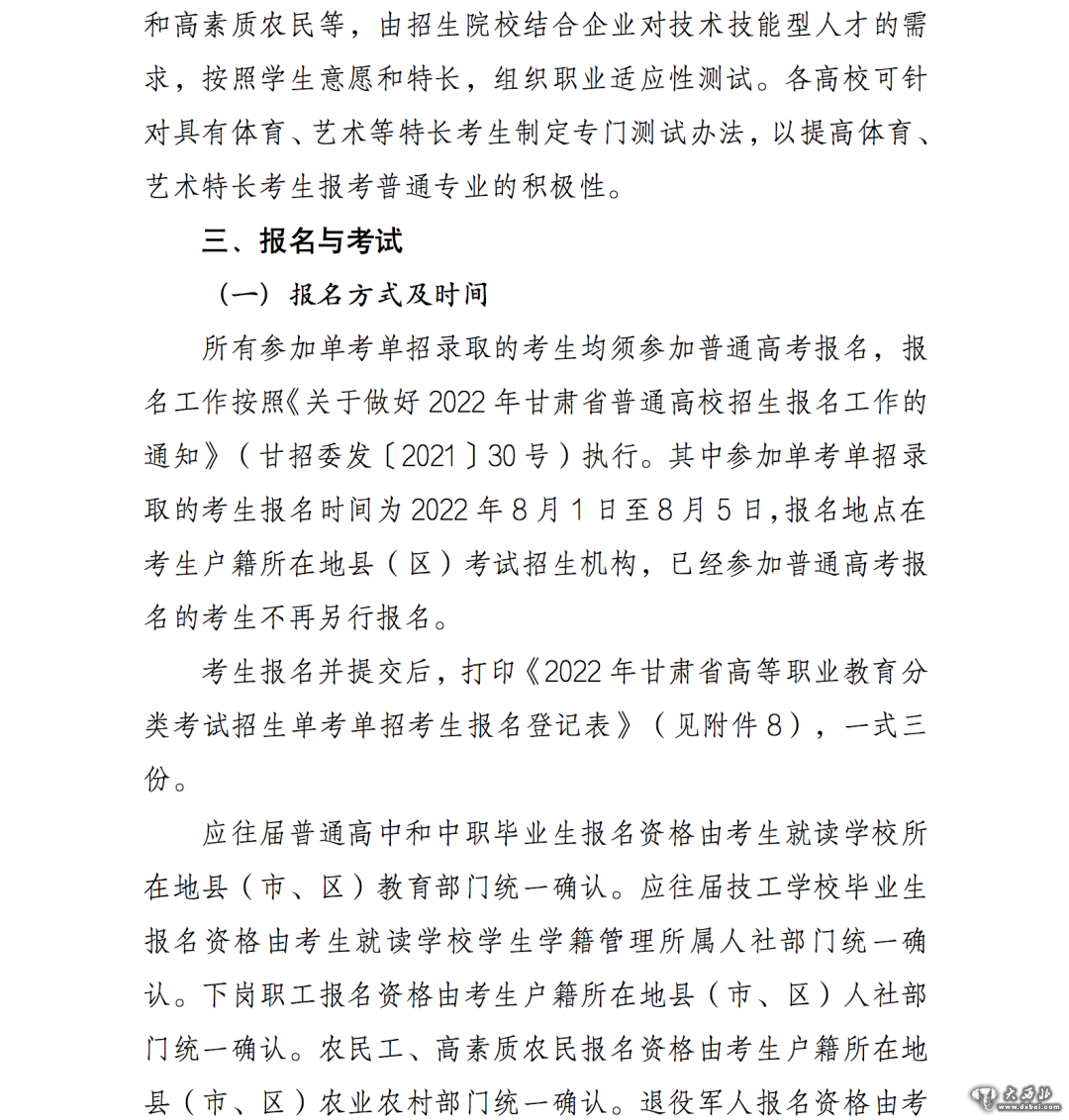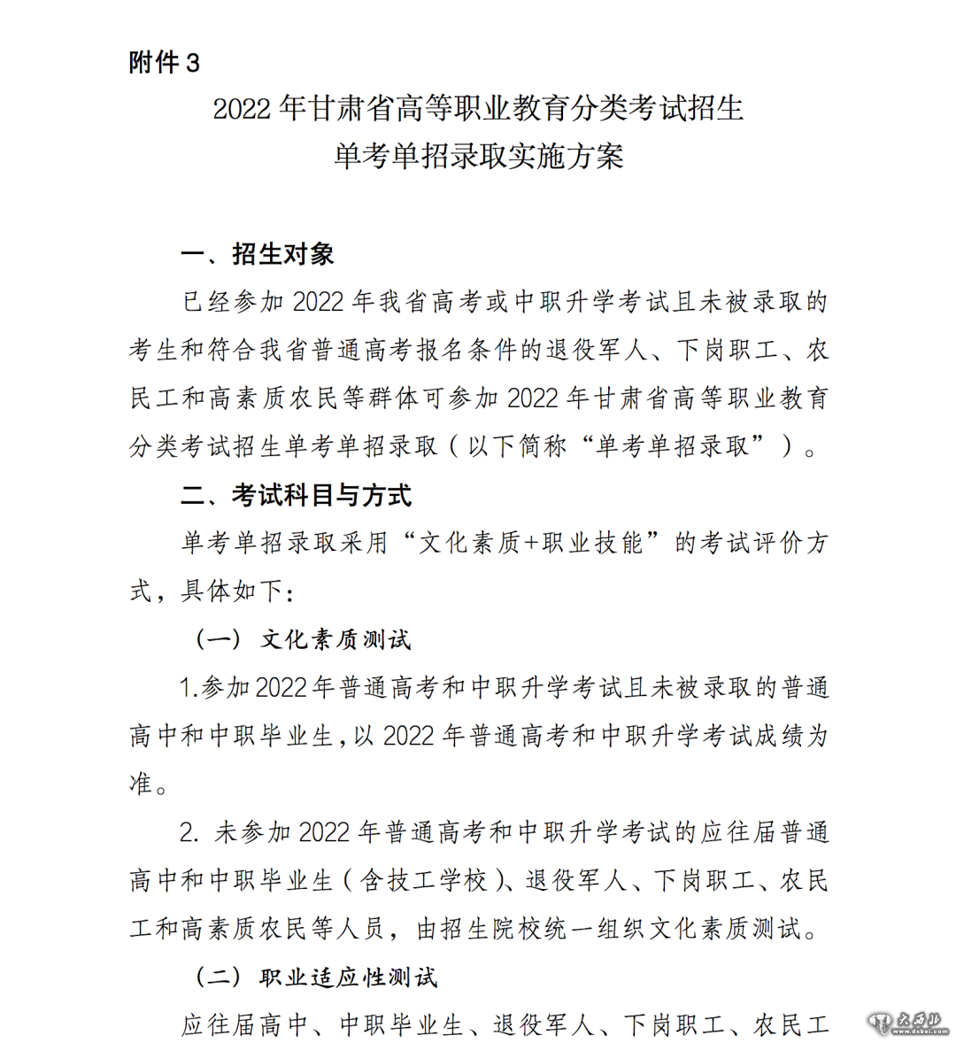 3.2022年甘肃省高等职业教育分类考试招生单考单招实施方案