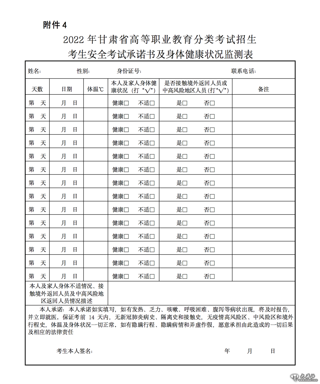 4.2022年甘肃省高等职业教育分类考试招生考生安全考试承诺书及身体健康状况监测表