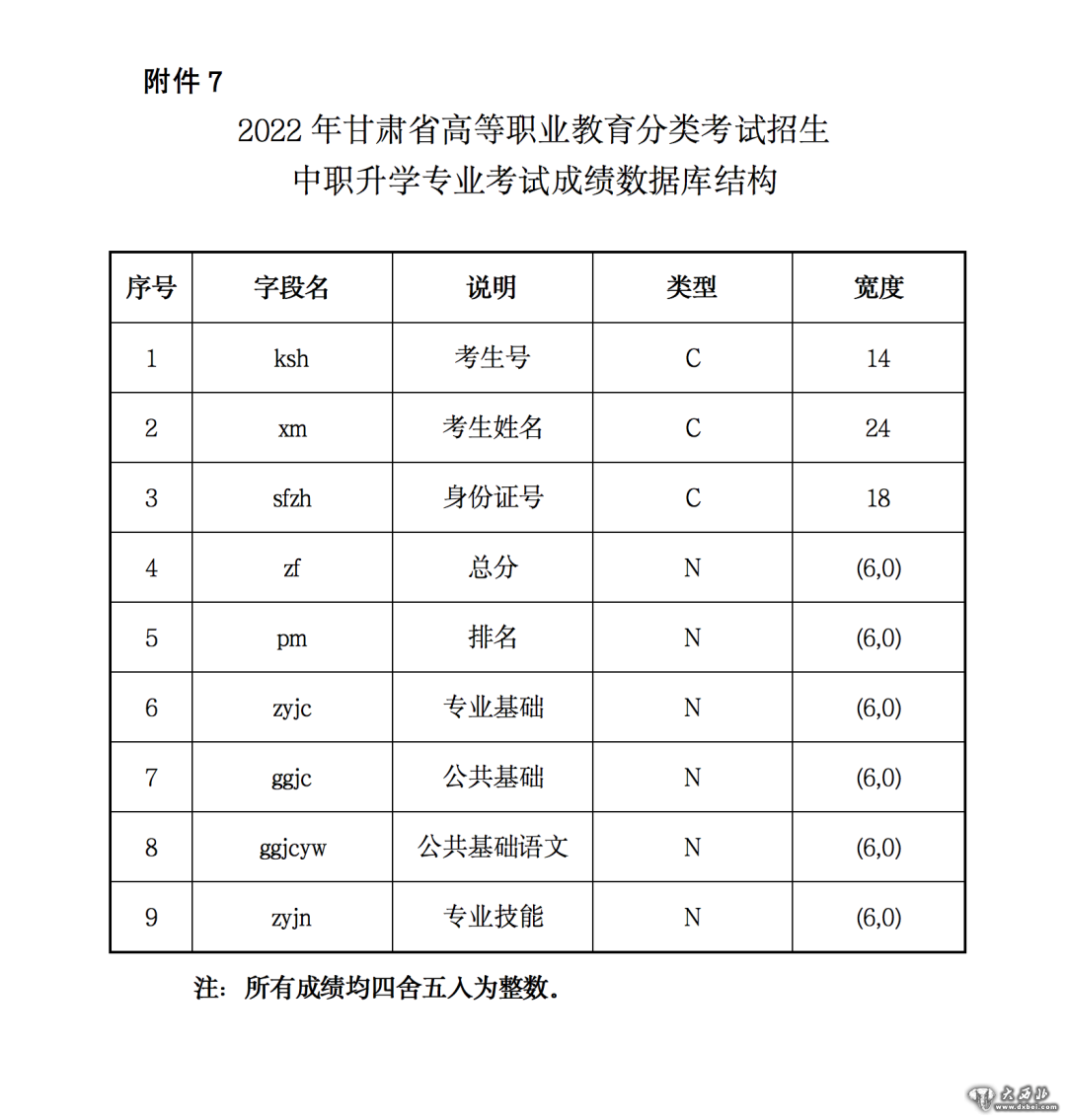 7.2022年甘肃省高等职业教育分类考试招生中职升学考试成绩数据库结构
