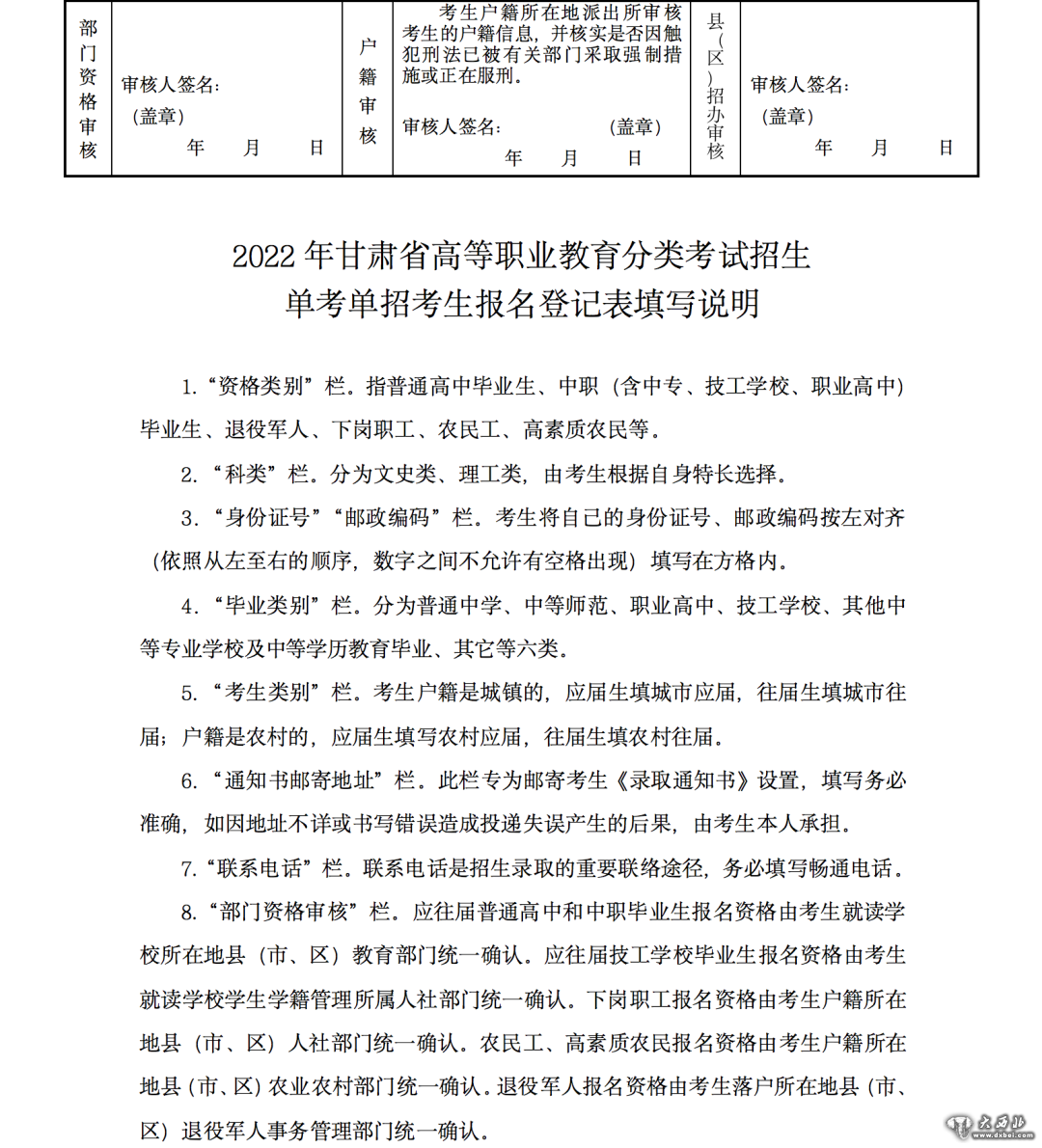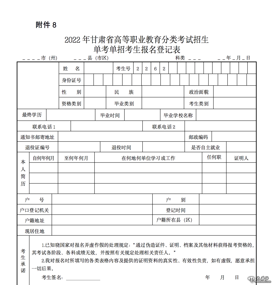 8.2022年甘肃省高等职业教育分类考试招生特殊群体考生报名登记表