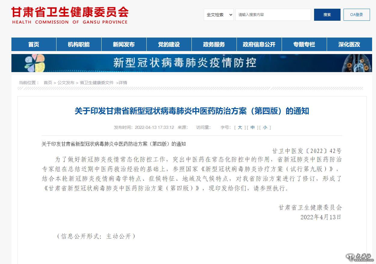 关于印发甘肃省新型冠状病毒肺炎中医药防治方案(第四版)的通知