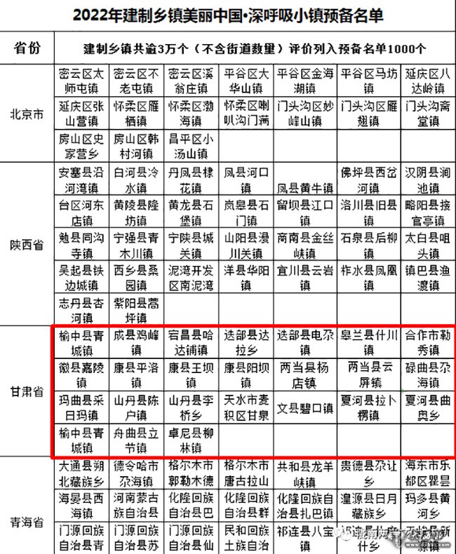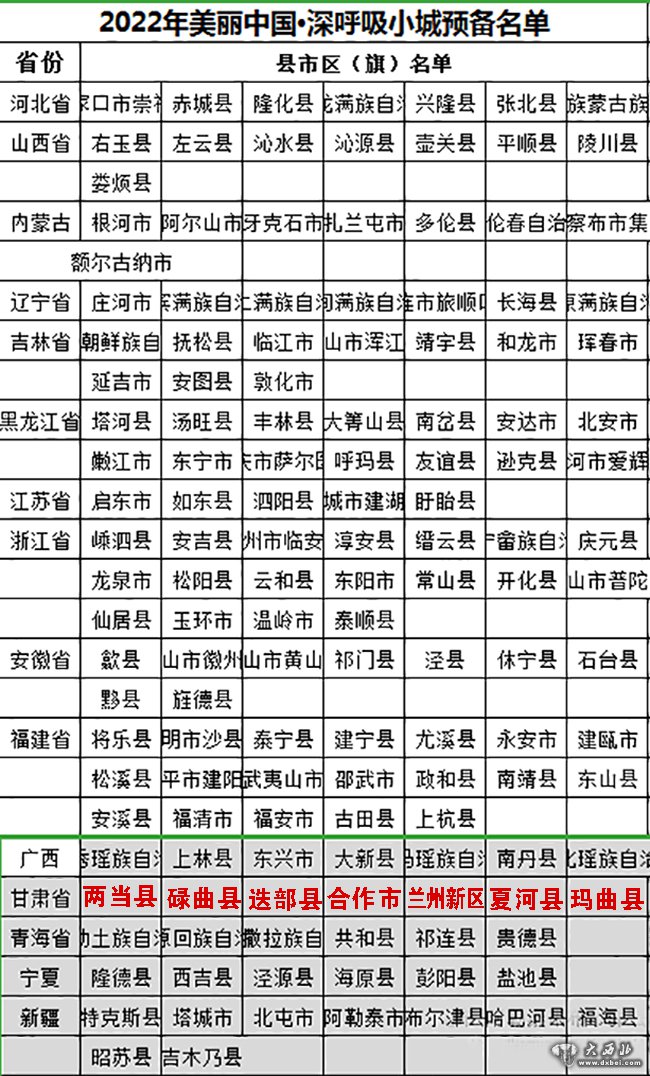 2022年4月17日,中国国土经济学会主办、北京全域空间规划设计研究院承办的《深呼吸小城2022年度绿色发展报告》初期科研成果在北京发布。甘肃省两当县、碌曲县、迭部县、合作市、兰州新区、夏河县、玛曲县等七地入选2022年美丽中国•深呼吸小城预备名单,榆中县青城镇、皋兰什川镇、宕昌县哈达铺镇、两当县杨店镇等24个镇入选2022年建制乡镇美丽中国•深呼吸小镇预备名单。