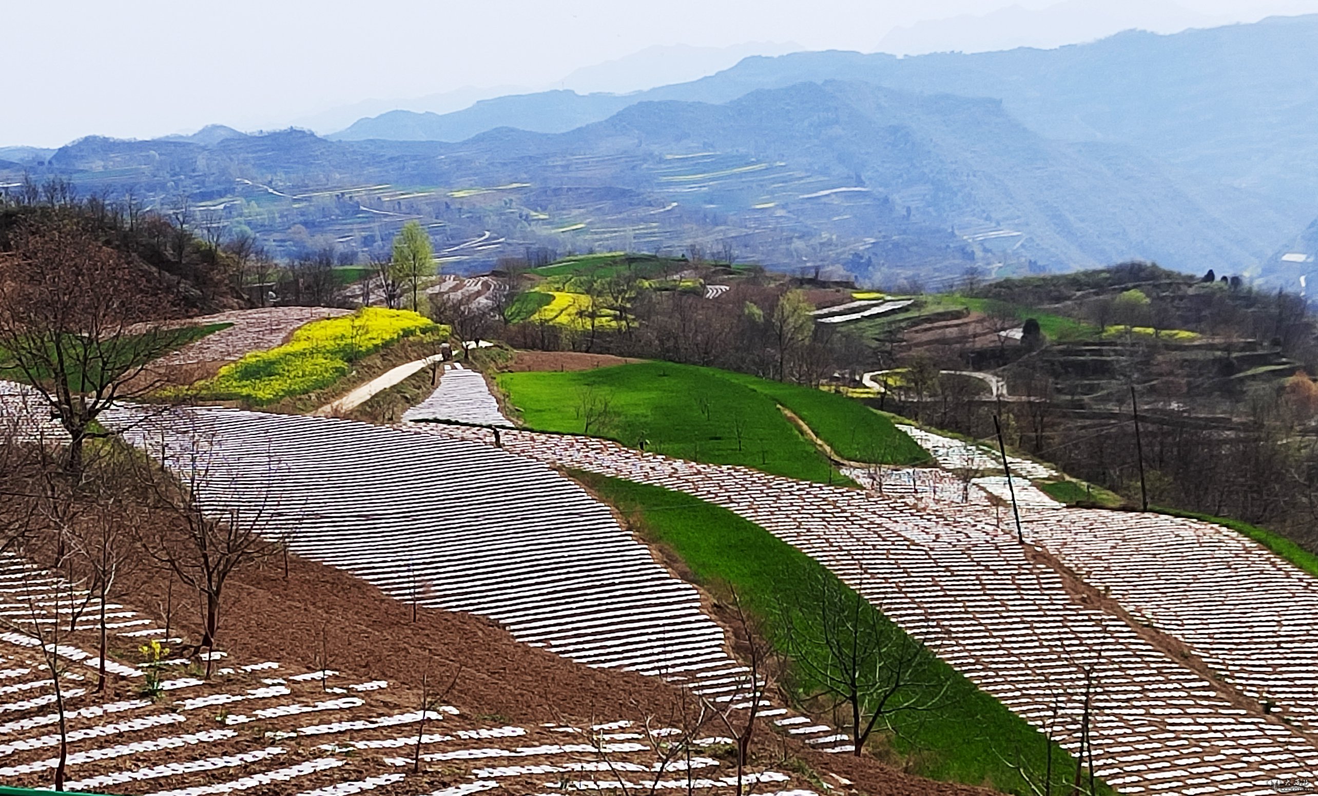 阳光的照射下,铺设好的地膜宛若一个个“春天的指纹”,银白的地膜、黄色的土地、翠绿的青山交相辉映,生机勃勃的美丽乡村景象尽收眼底。而在一年前,由于村里的年轻劳动力大多选择外出务工,眼前这片充满生机的土地还普遍存在土地撂荒的现象。