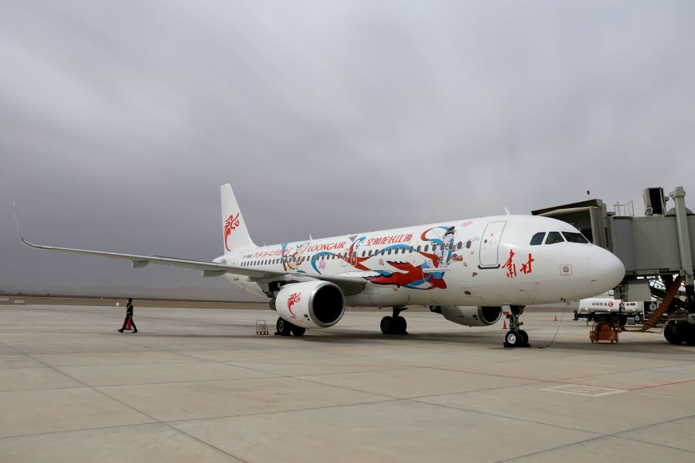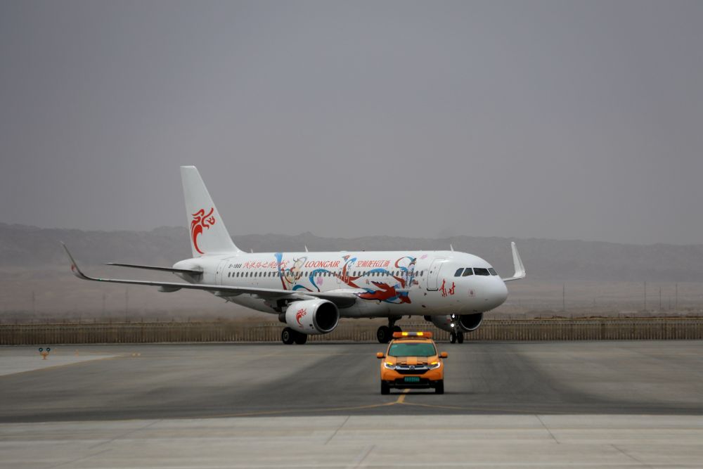 4月28日,浙江长龙航空兰州—张掖—敦煌首航航班降落在甘肃敦煌莫高国际机场。新华社发(张晓亮摄)