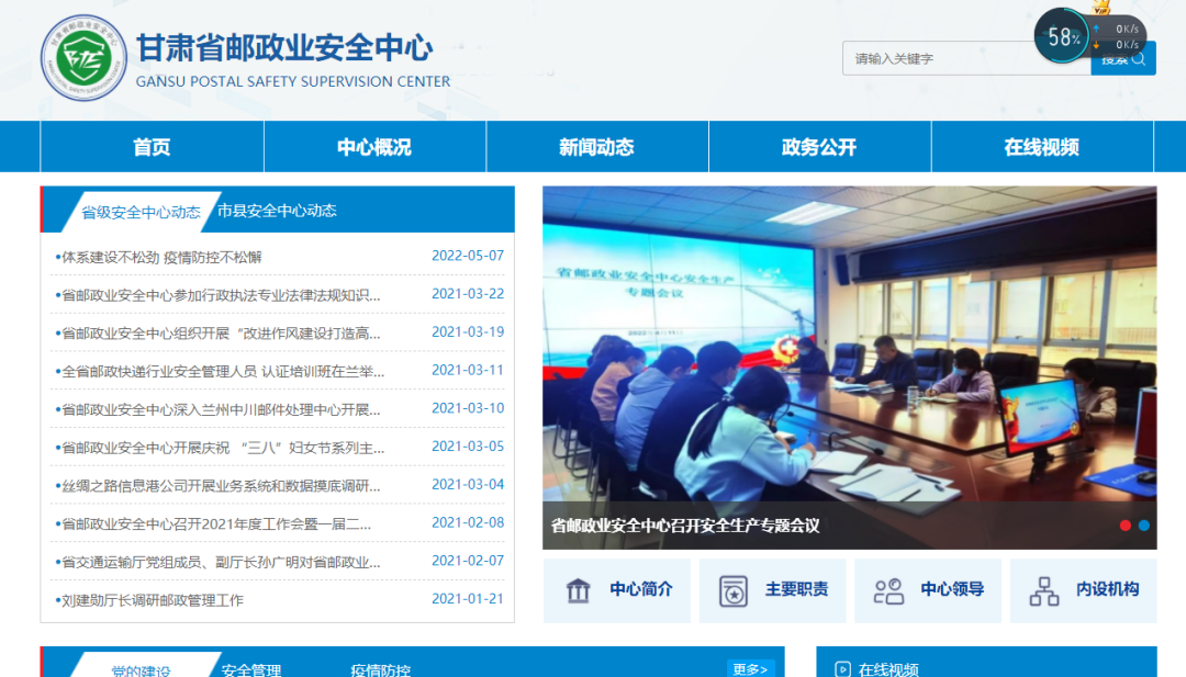 甘肃省邮政业安全中心网站历经1个多月集中攻关,开发完成并成功上线运行,网站设省级中心动态、市县中心动态、党的建设、安全管理、疫情防控、通知公告等栏目,链接国家邮政局申诉网站、安易递管理平台,可实现各级中心动态信息在线推送,并可打通微信公众号、新浪微博、抖音等多家社交媒体账号实现跨主流社交平台信息一键流转等功能。
