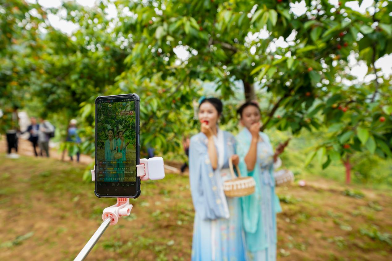 汉服爱好者正在成县小川镇西狭村樱桃园直播推介大樱桃。