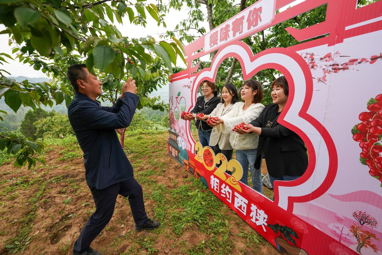 游客在成县西狭村樱桃园体验采摘樱桃、拍照留念。