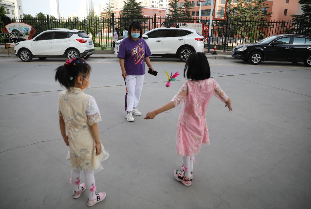 5月27日,张培琴带然然和智智(左一)一起踢毽子。新华社记者杜哲宇摄