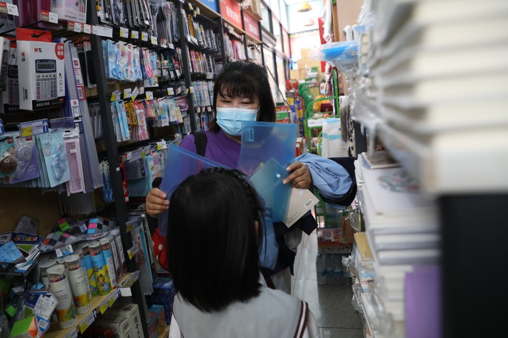 5月27日,张培琴带然然在放学回家路上买文具。新华社记者杜哲宇摄
