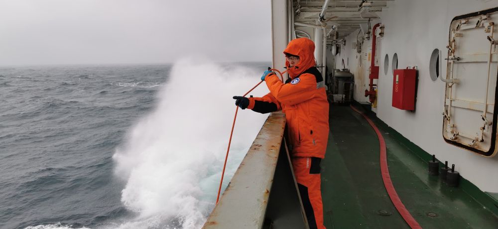 巨浪拍打下,船只倾斜度大,采集海水的工作比较危险。一桶海水,重量达10公斤。李传金便和队友拴好安全绳,戴好头盔,防止从甲板上掉到海里。就这样,他们在船只剧烈摇摆下来来回回打了20多桶海水。