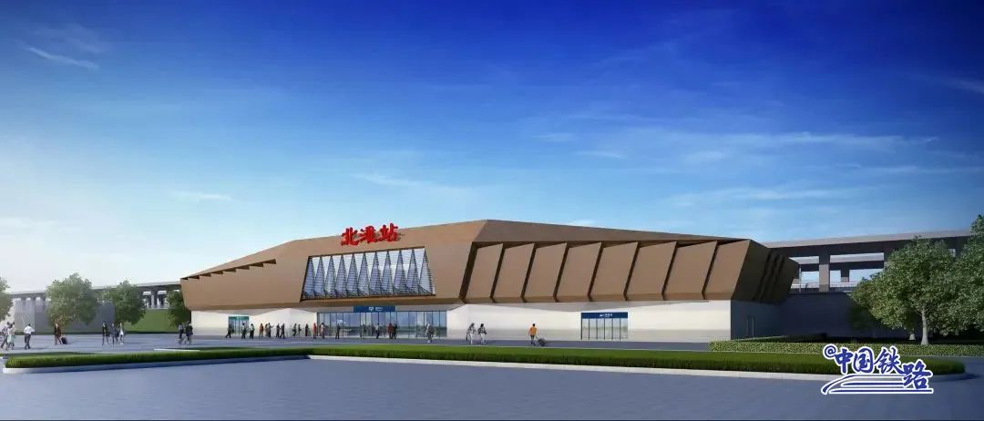 站房设计体现了庄重、现代的建筑形态,整体的真石漆墙面凸显了站房的一体性,两侧折面阵列象征着北滩农贸作物的兴旺发展。