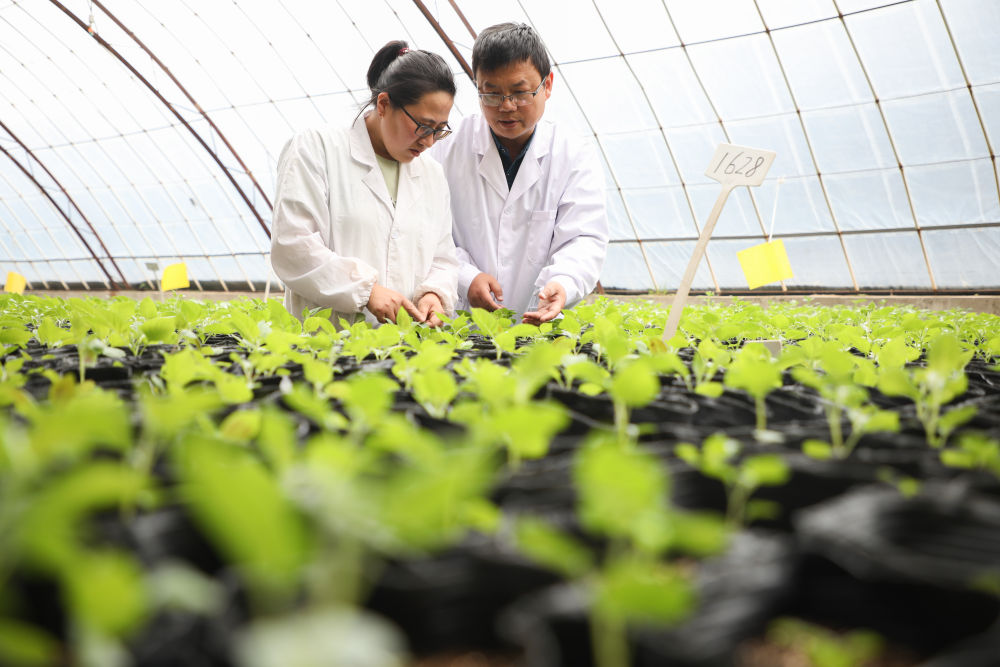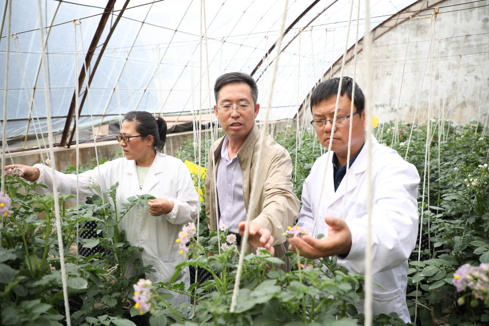 6月9日,在甘肃省定西市农业科学研究院的日光温室,科研人员查看马铃薯杂交育种情况。新华社记者马希平摄