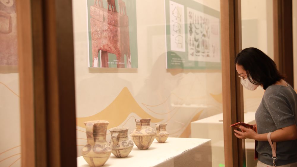 6月11日,游客在甘肃省博物馆参观木本水源——黄河流域史前文明展。新华社记者何问摄