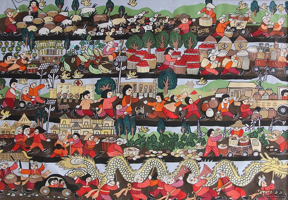 (2)尊古与创新。敦煌壁画与农民画的创作主题、创作图式、创作经验、艺术风格研究,把握传承和创新的关系,提升农民画的文化内涵、艺术价值。