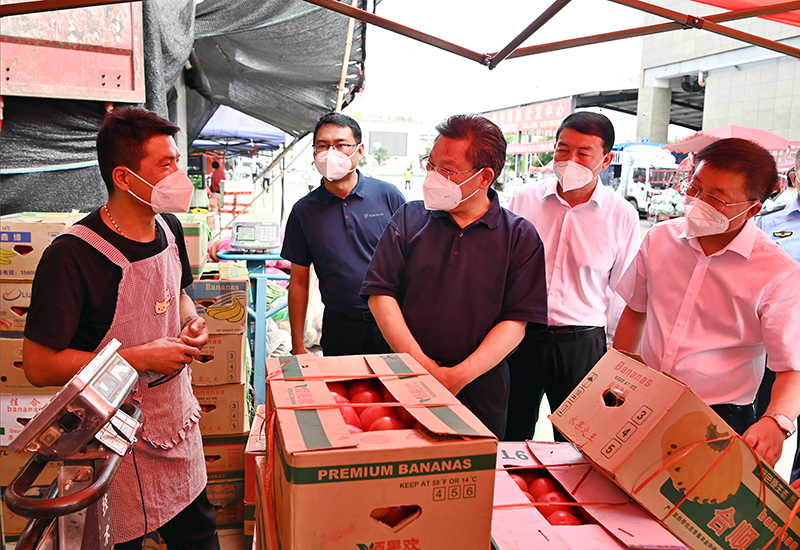 任振鹤首先来到兰州国际高原夏菜副食品采购中心,与工作人员和市场商贩亲切交谈,详细了解货源组织、物流保畅、批发供应、价格监管、核酸检测、闭环管理、个人防护等情况。他强调,“菜篮子”稳定是疫情防控的重要保障,兰州国际高原夏菜副食品采购中心是兰州乃至西北地区最大的农副产品流通集散中心,既是保障供应的重点基地,也是容易输入疫情并导致疫情扩散的高风险之地,容不得丝毫懈怠和闪失。要认真总结此次疫情防控中的经验教训,突出防控重点,抓住关键环节,严格闭环管理、优化核酸策略、规范个人防护、加强环境消杀、做好服务保障,切实把每一个环节的细小问题做深做实,敏锐感知风险点,迅速阻断传染源,主动防、早发现、快处置,做到病毒要防、物流要畅、保供要稳。要在安全的前提下激发市场活力,压实行业责任、单位责任、个人责任,既要从严从紧、科学精准防控,也不搞简单化、一刀切,把筑牢疫情防线与方便生产生活统一起来,让商贩多拉快跑、市场购销两旺。政府部门要积极搭桥牵线、穿针引线,充分发挥大型集散中心作用,更大力度推动“地道甘味”走出去。
