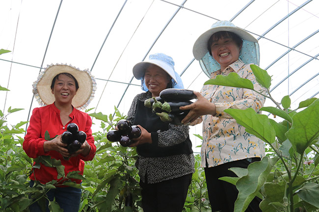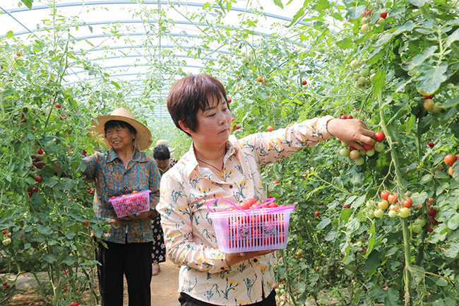 圣女果、茄子、辣椒、南瓜,红的、紫的、绿的、黄的……挂满枝头,农户们边开心的聊天,边娴熟的进行着采摘,额头、鼻尖、脖子上挂满了汗珠都顾不上擦。
