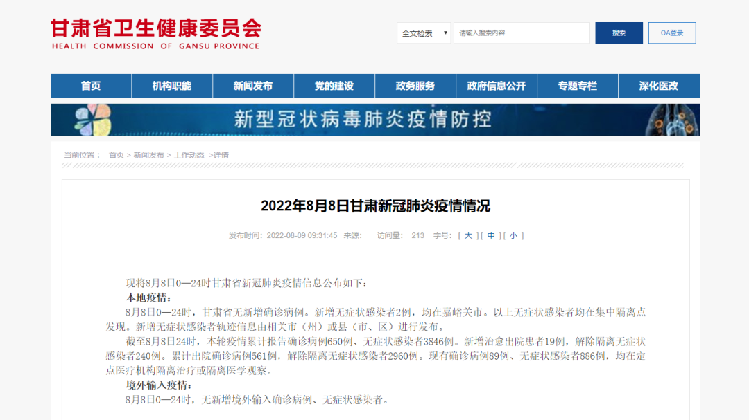 现将8月8日0—24时甘肃省新冠肺炎疫情信息公布如下: