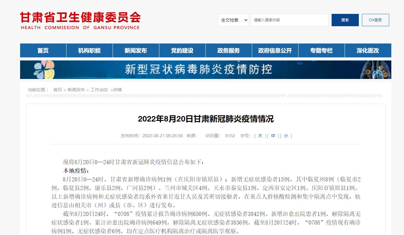 8月20日0—24时,甘肃省新增确诊病例1例(在庆阳市镇原县);新增无症状感染者15例,其中临夏州8例(临夏市2例,临夏县2例,康乐县2例,广河县2例)、兰州市城关区4例、天水市秦安县1例、定西市安定区1例、庆阳市镇原县1例。以上新增确诊病例和无症状感染者均系外省来甘返甘人员及其密切接触者,在重点人群核酸检测和集中隔离点中发现,轨迹信息由相关市(州)或县(市、区)进行发布。