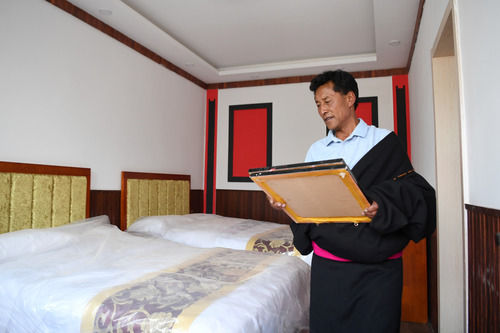 甘南藏族自治州碌曲县尕海镇尕秀村村民拉毛加在收拾自家开办的藏家乐客房。新华社记者陈斌摄