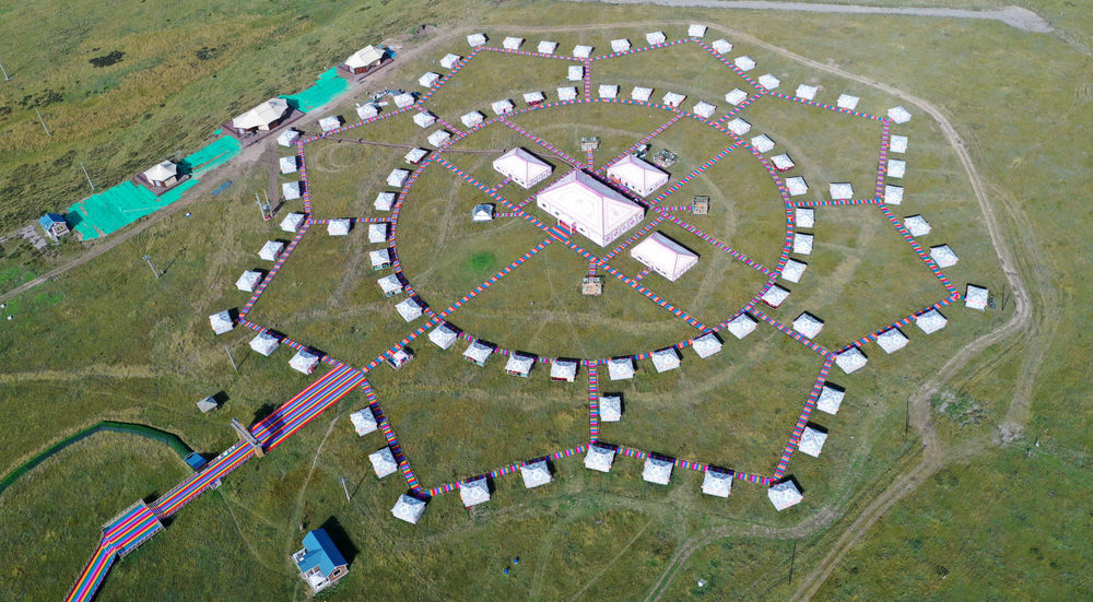 这是甘肃省甘南藏族自治州碌曲县尕海镇尕秀村帐篷城景区(无人机照片,2021年9月9日摄)。新华社记者陈斌摄