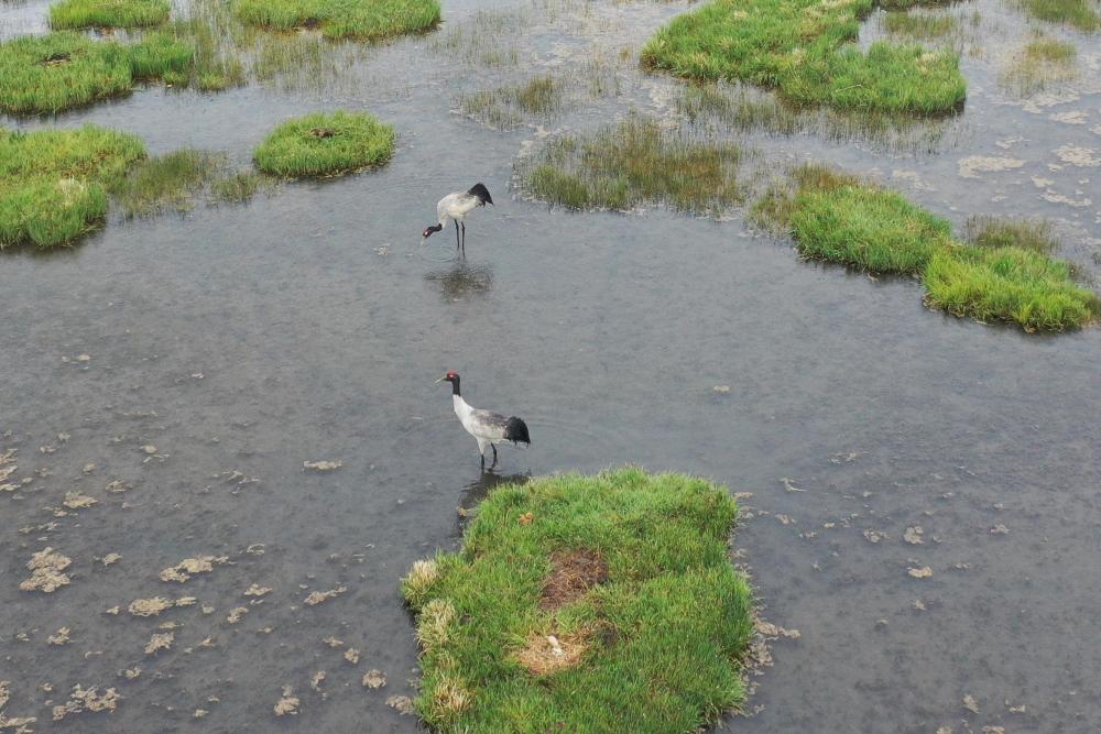 这是在甘肃省甘南藏族自治州碌曲县尕海湖拍摄的国家一级保护动物黑颈鹤及其幼鸟(无人机照片,2021年6月2日摄)。新华社记者杜哲宇摄