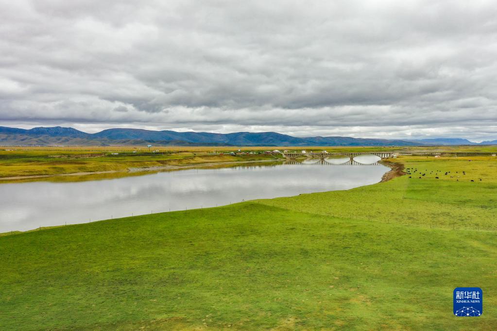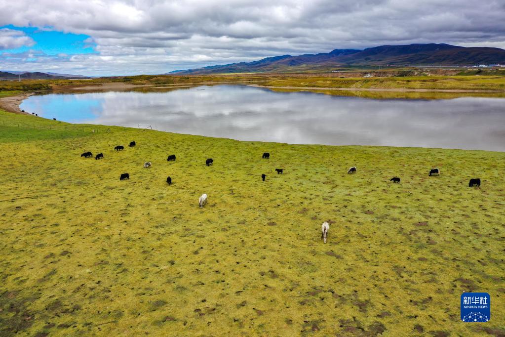 牛群和马在黄河玛曲段干流沿岸的一处草地上吃草(9月17日摄,无人机照片)。玛曲县在2019年就实现了草畜平衡。
