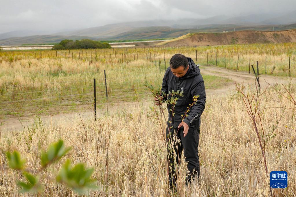 玛曲县自然资源局高级工程师马建云在黄河玛曲段干流沿岸一处阻沙林带建设区域观察植被生长情况(9月16日摄)。