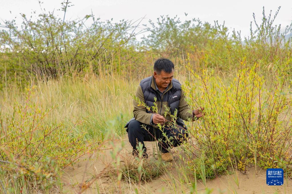 玛曲县自然资源局高级工程师马建云在黄河玛曲段干流沿岸的一处阻沙林带建设区域观察草方格沙障内植被生长情况(9月16日摄)。