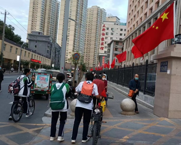 我说:“关注你在举国欢庆之日,你的自行车挂的五星红旗!”