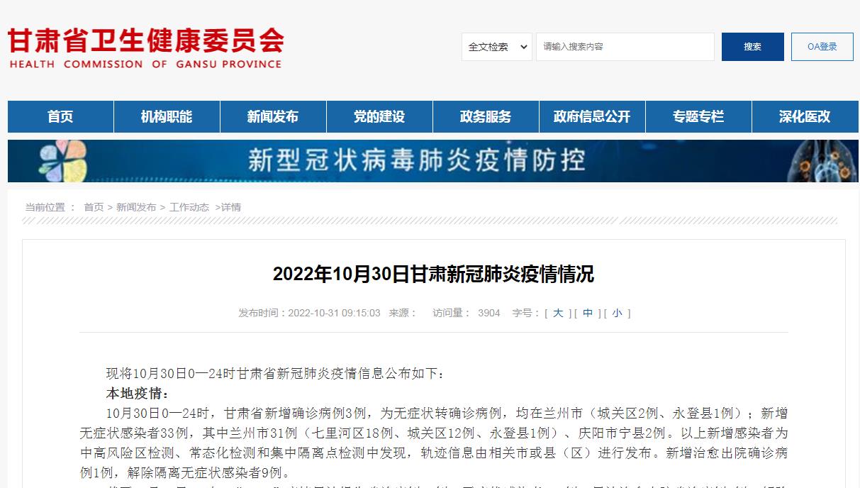 10月30日0—24时,甘肃省新增确诊病例3例,为无症状转确诊病例,均在兰州市(城关区2例、永登县1例);新增无症状感染者33例,其中兰州市31例(七里河区18例、城关区12例、永登县1例)、庆阳市宁县2例。以上新增感染者为中高风险区检测、常态化检测和集中隔离点检测中发现,轨迹信息由相关市或县(区)进行发布。新增治愈出院确诊病例1例,解除隔离无症状感染者9例。