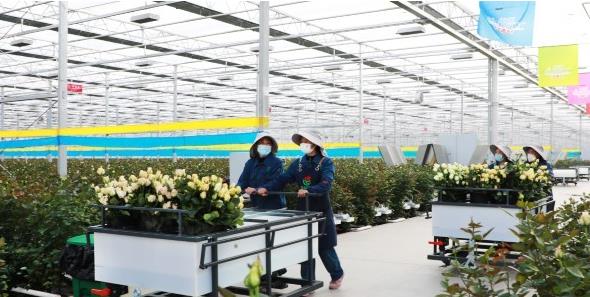 智能温室里,各色玫瑰竞相开放,娇艳欲滴。拦丽丽精心打理着玫瑰枝叶,小心地埋压侧枝。“在花丛里工作,心情都不一样。”这是今年29岁的拦丽丽在百益亿农国际鲜花港工作的第七个月。鲜花港项目坐落在她的家乡,甘肃省临夏回族自治州临夏市枹罕镇。