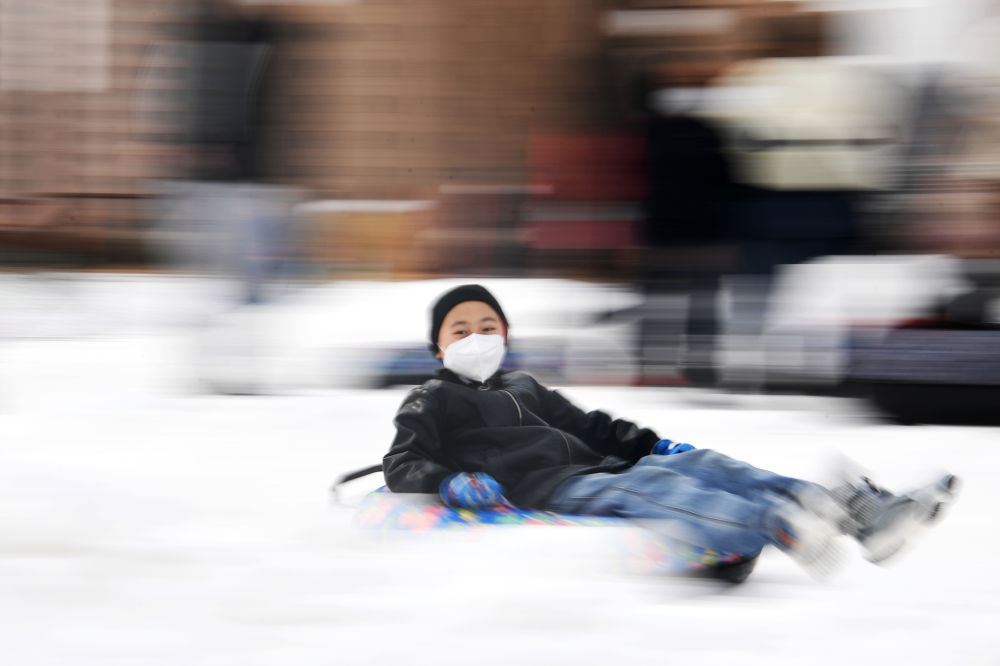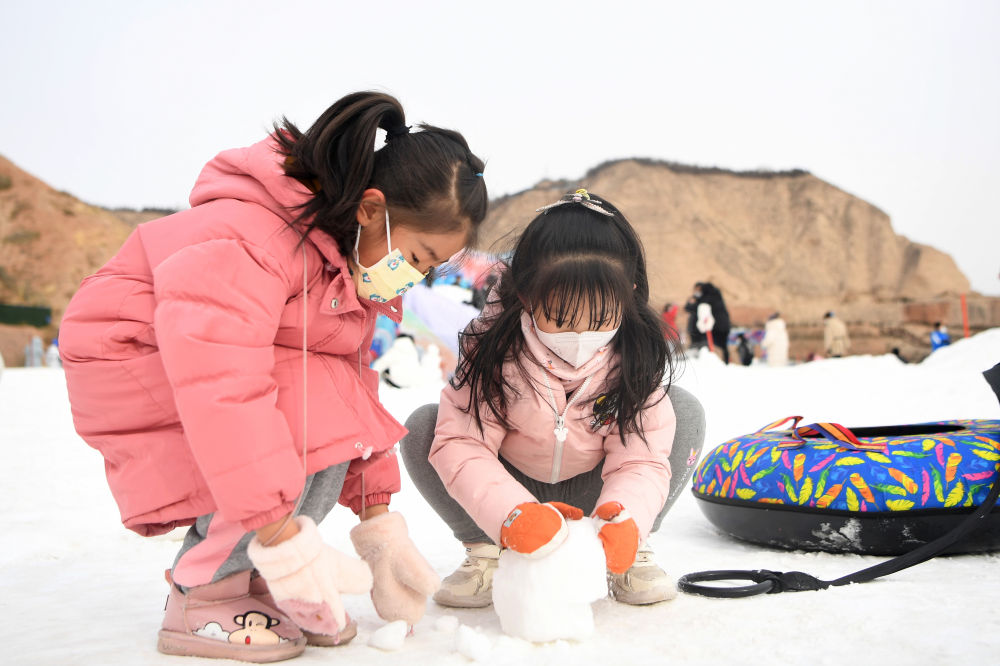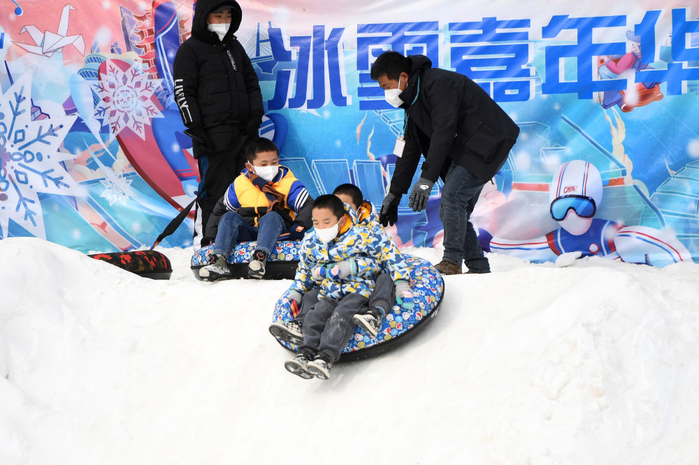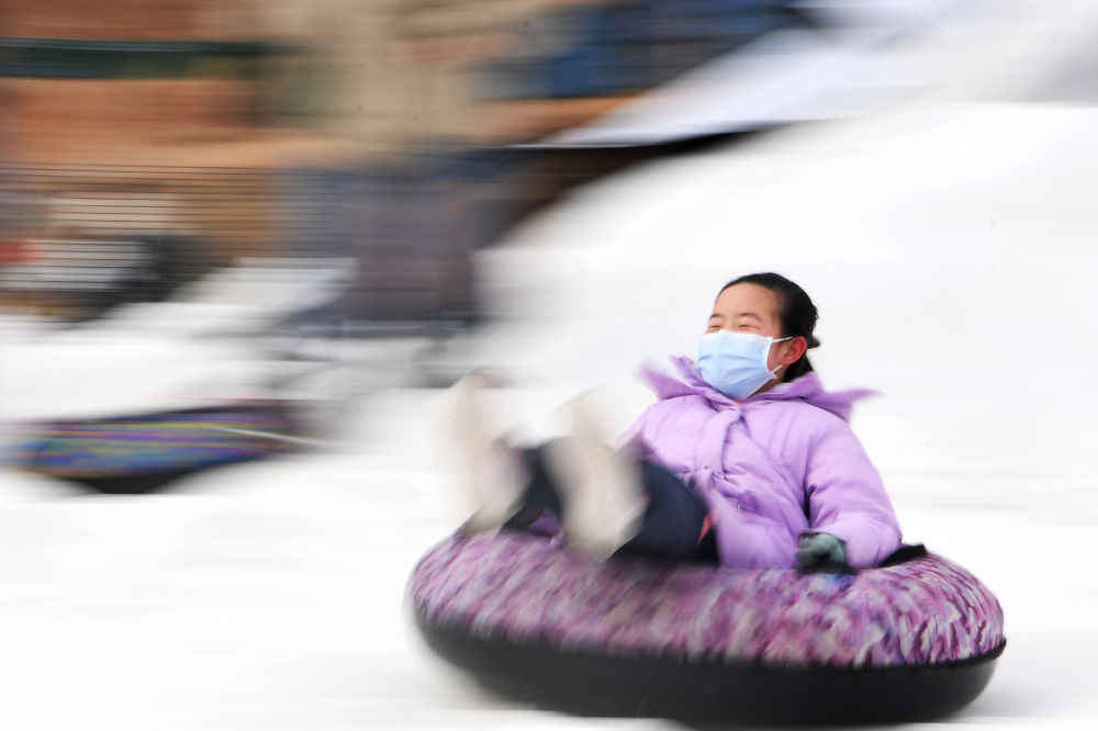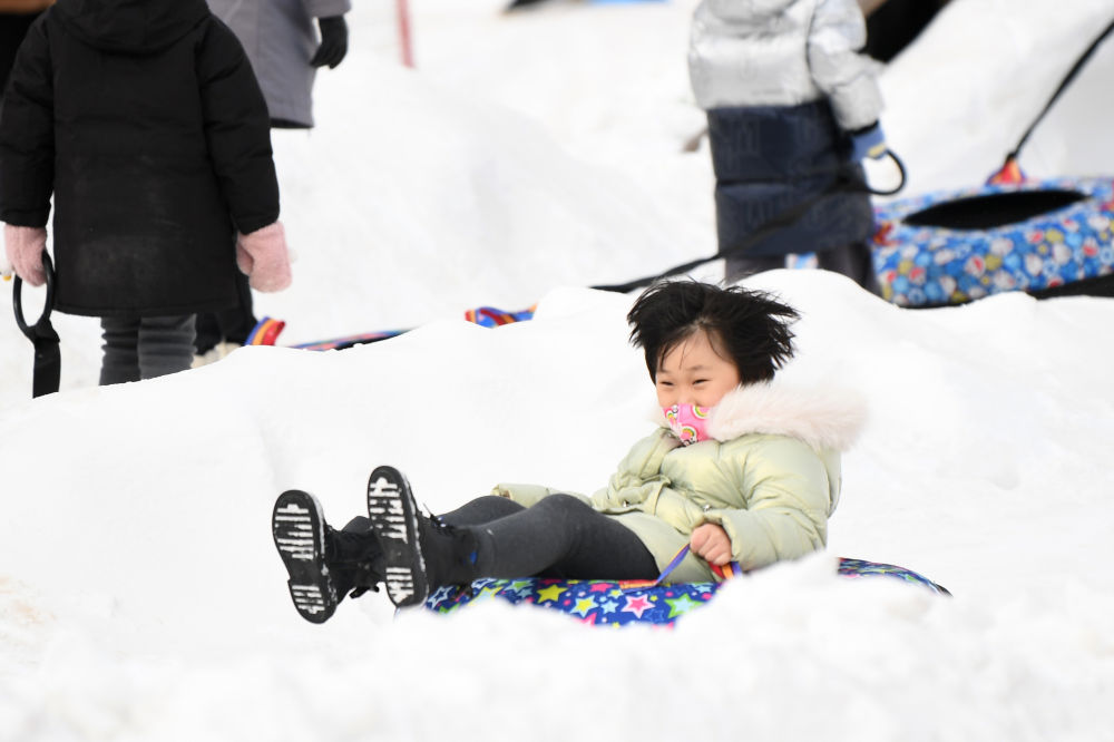12月25日,在兰州市北山林场,小朋友在冰雪嘉年华上体验雪地娱乐项目。新华社记者陈斌摄