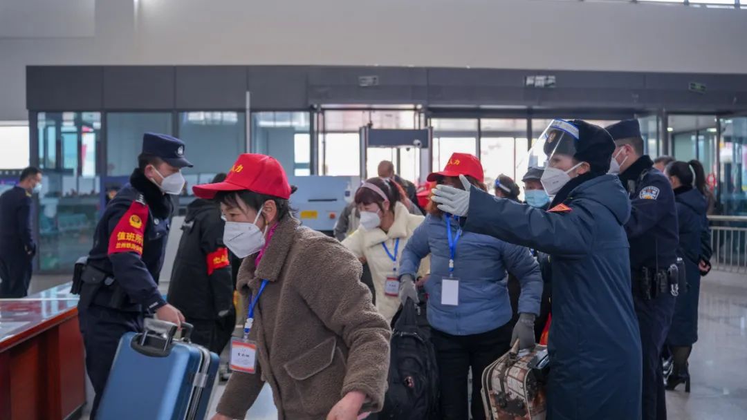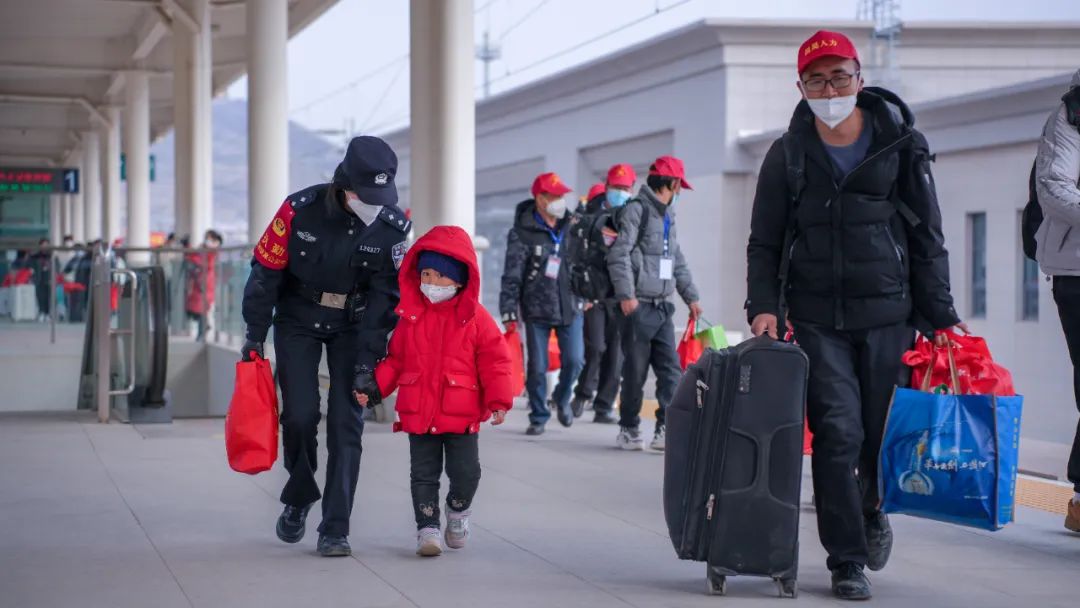车站铺画务工人员进站乘车流向图,划定专门候车进站区域,由专人做好客流分解疏散和引导工作,组织党团员青年志愿者开展志愿服务,确保务工人员有序进站上车。
