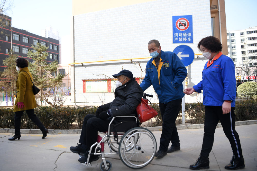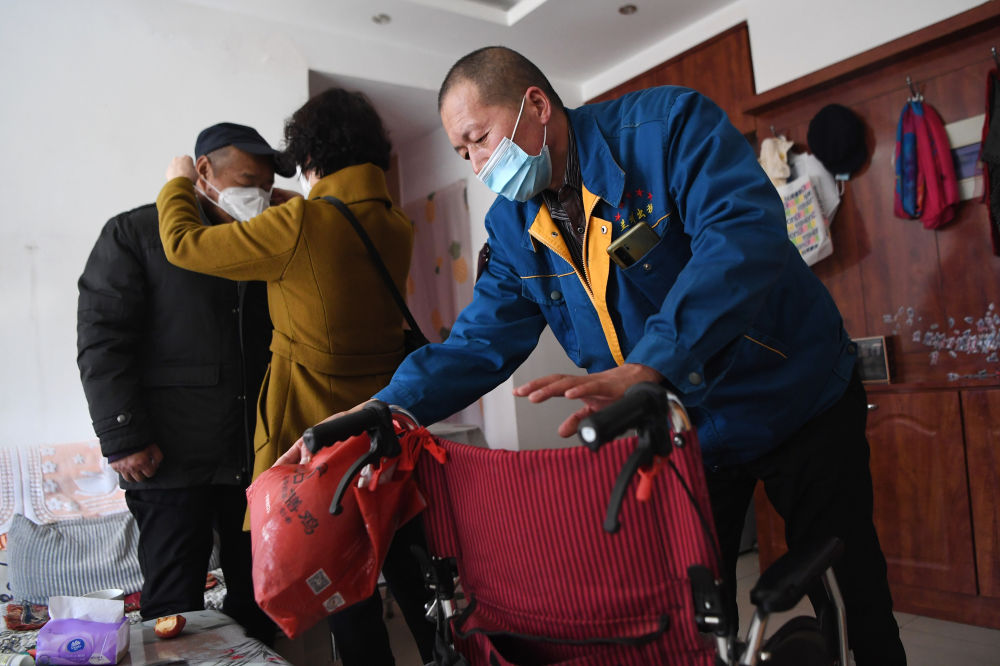 强汉红(右一)上门为一位长期患病的老人收拾轮椅,准备接送老人去医院就医(3月1日摄)。新华社记者陈斌摄