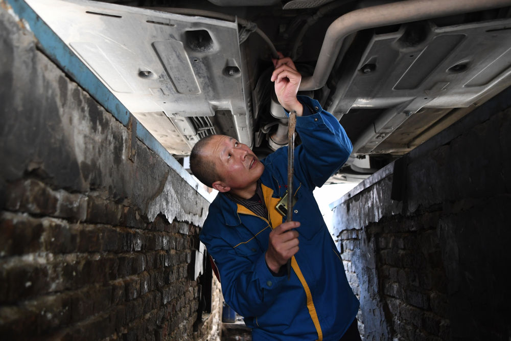 强汉红在检查车辆(3月1日摄)。新华社记者陈斌摄